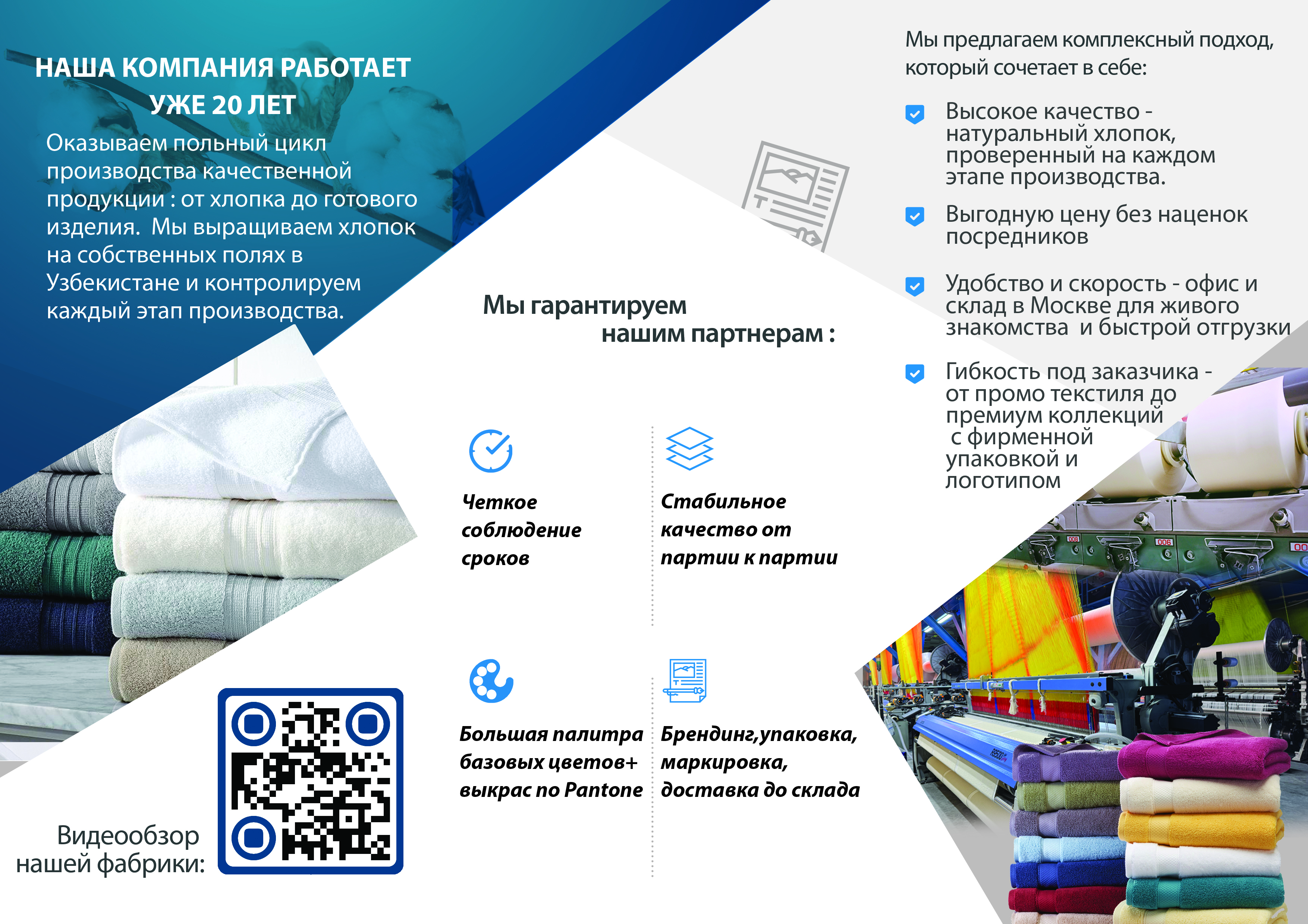 Полный цикл и собственное производство-ваш доступ к фабрике без участия посредников. Мы контролируем весь путь продукции от хлопкового поля в Узбекистане до склада в Москве.