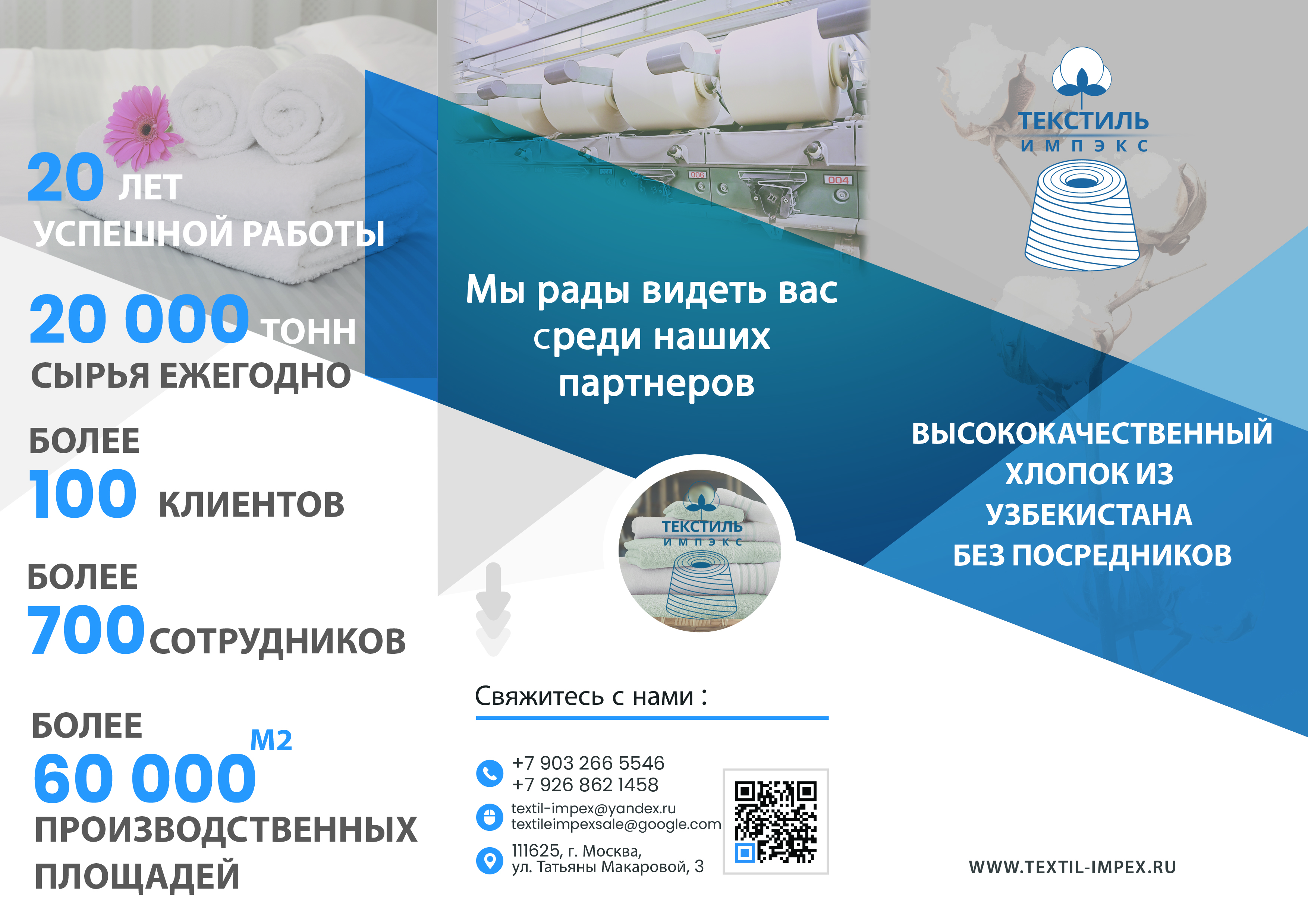 Компания «ТЕКСТИЛЬ-ИМПЭКС» более 20 лет производит и поставляет хлопчатобумажную пряжу, ткани и готовый текстиль в Россию. За это время мы вошли в число крупнейших игроков рынка и обеспечиваем около 40% потребностей российской текстильной промышленности в х/б пряже. Нас выбирают за надёжность, прозрачные условия и неизменно высокое качество. Наши партнёры это средние и крупные оптовики, которые ценят стабильность, предсказуемое качество и честные цены.